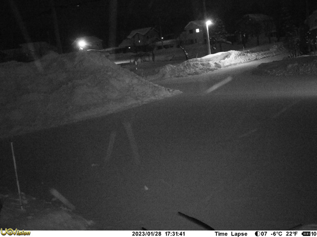 同日の夜。吹雪いていたようで、雪が短い線のように写っています。